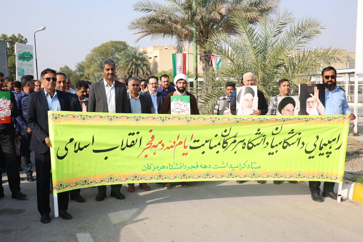 راهپیمایی به مناسبت فرارسیدن دهه مبارک فجر و سالروز پیروزی شکوهمند انقلاب اسلامی ایران، با حضور اعضای هیئترئیسه، اساتید وکارکنان دانشگاه برگزار شد. این مراسم با هدف گرامیداشت ایامالله دهه فجر، تجدید میثاق با آرمانهای والای انقلاب اسلامی و پاسداشت یاد و خاطره امام خمینی (ره) و شهداء برگزار گردید. شرکتکنندگان با حضور پرشور خود، ضمن سر دادن شعارهای انقلابی، بر پایبندی به ارزشهای انقلاب اسلامی و ادامه راه شهدا تأکید کردند.